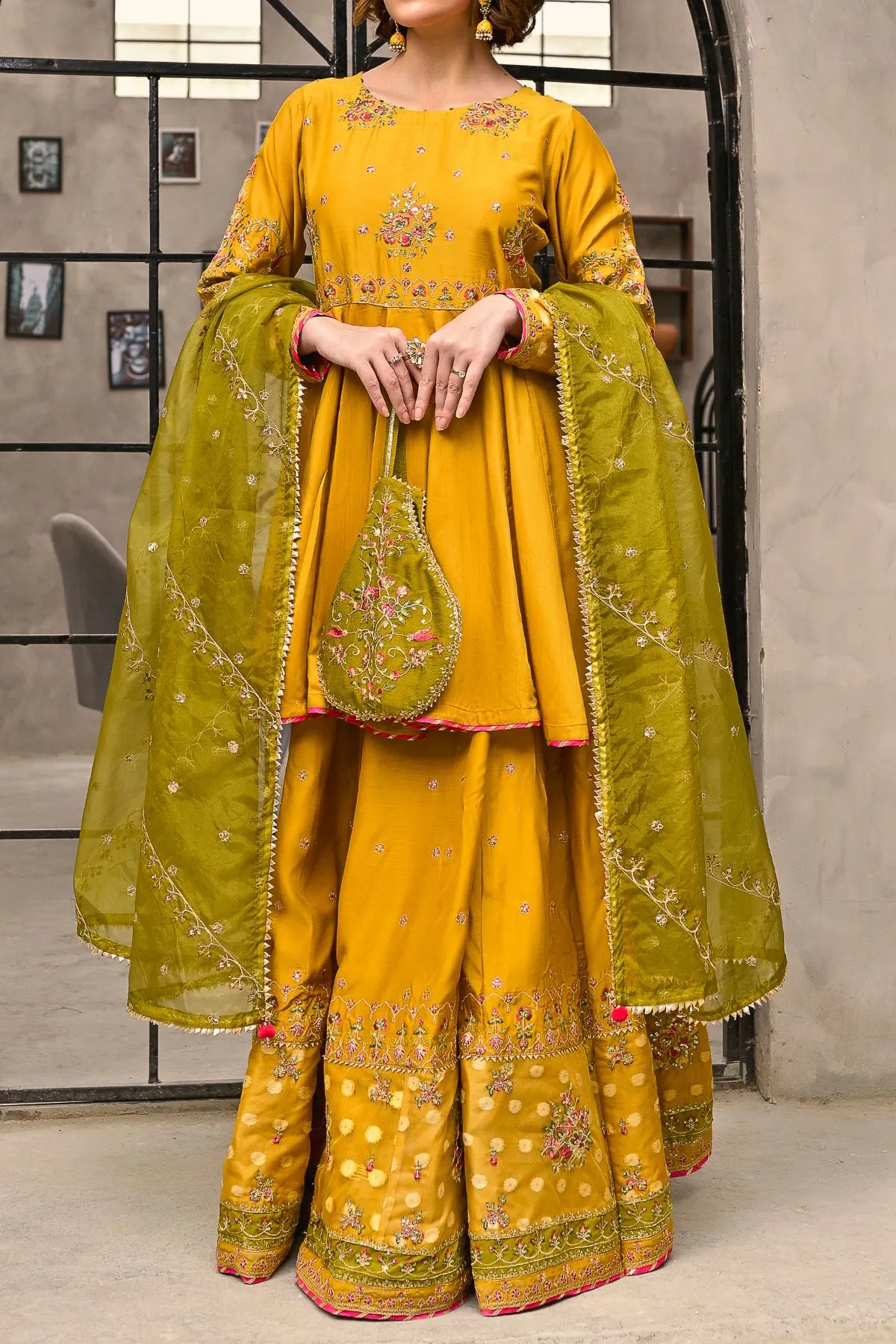 Includes and fabric; • Shirt; viscose • Lehanga: viscose • duppata: silk tissue • Color; mustard • Pattern; peplum with Lehanga • technique: embroidery work with dual sequins, hand embellishment Description; A classically rich composition is portrayed on this elegant ensemble rendered in an appealing mustard shade. It features a mesmerizing peplum beautifully adorned with intricate embroidery with floral designs in colors and enhanced with hand made tassals. Paired with beautifully designed Lehanga, this graceful yet elegant outfit is a style statement for Events gatherings to look stylish this season.