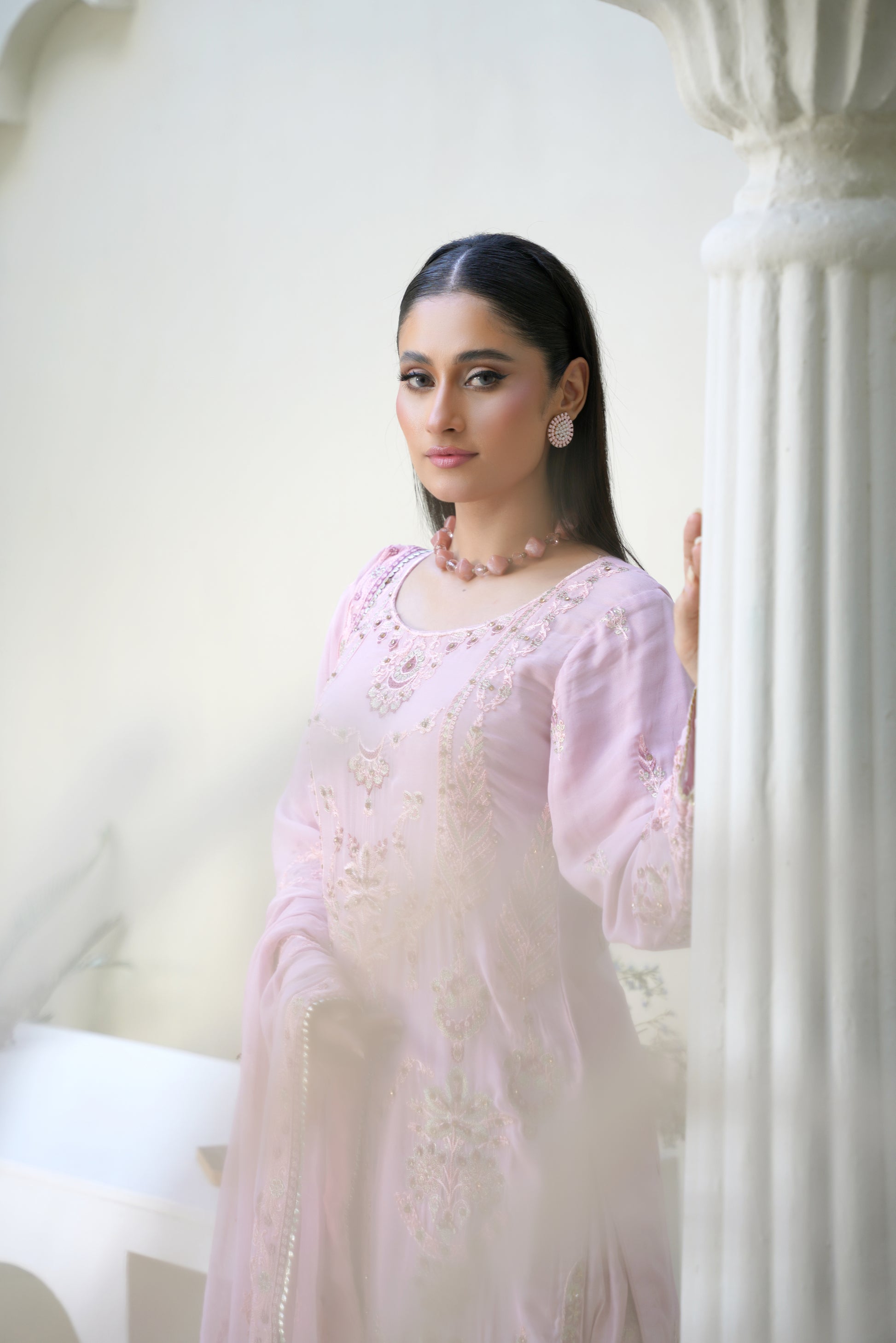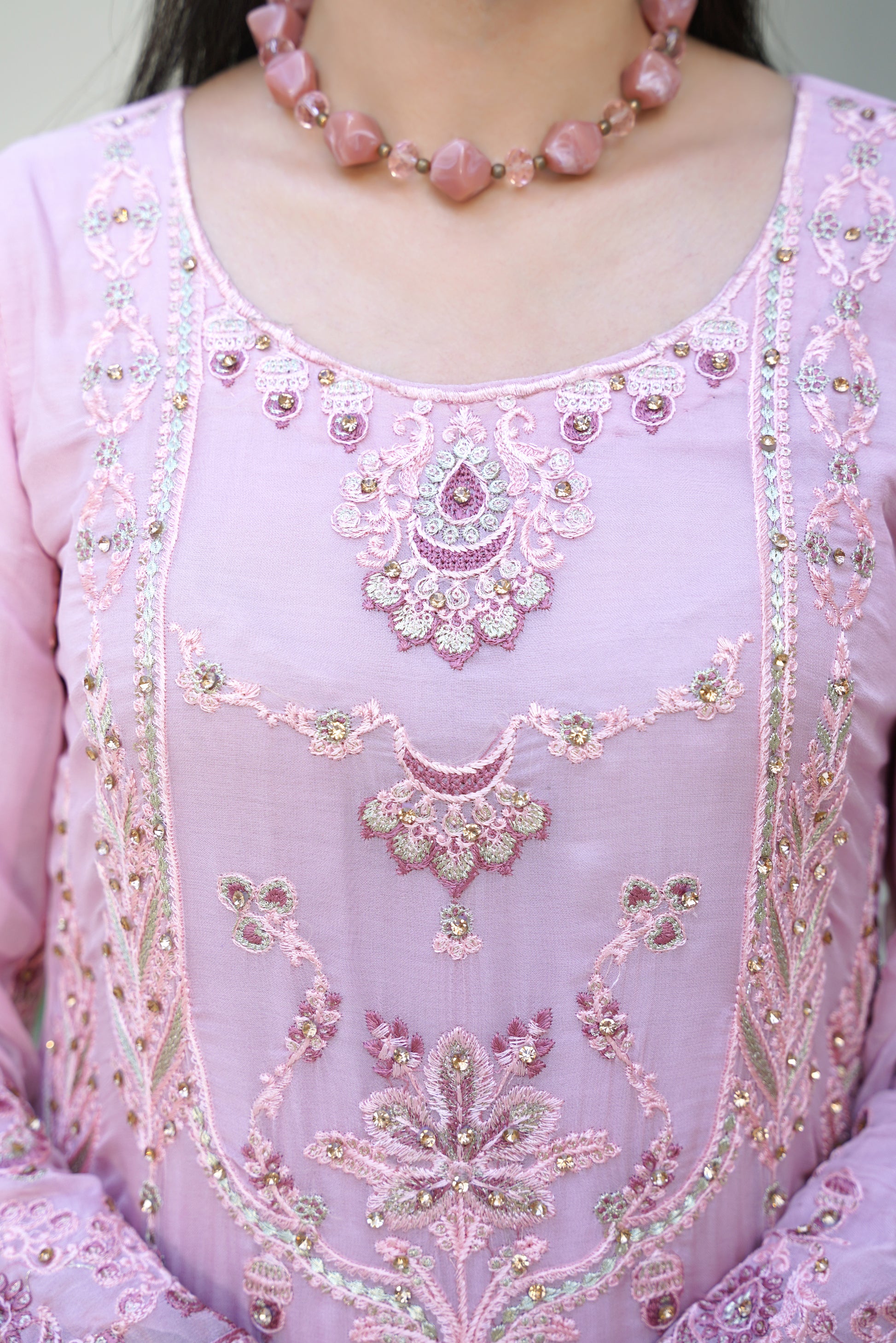 Description: Indulge in the richness of ethnic elegance with our Pink Chiffon article heavily embroidered with thread zari and sequins, The design is an ethnic masterpiece with gorgeous composition. It comes with straight trouser and an embroidered chiffon dupatta.