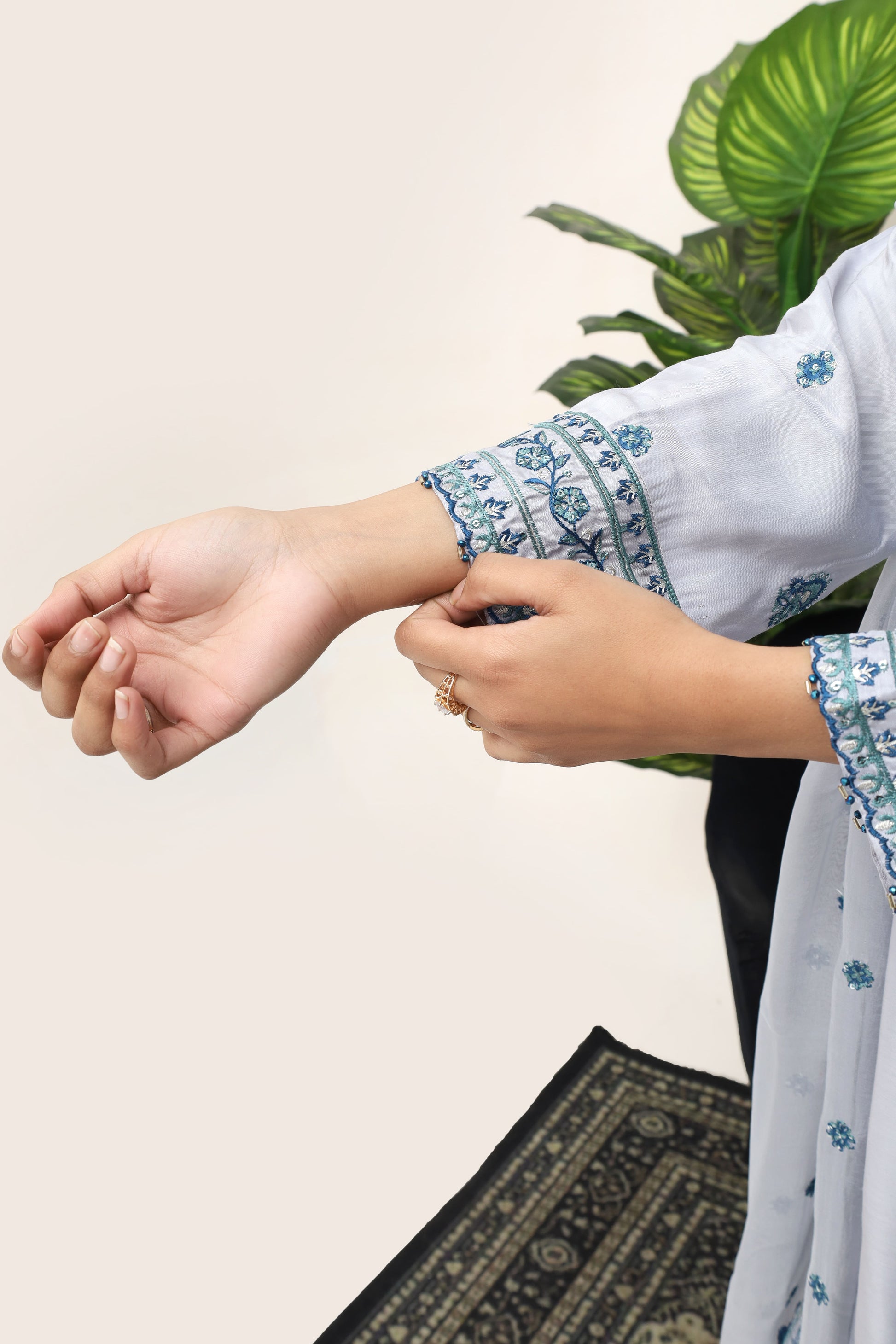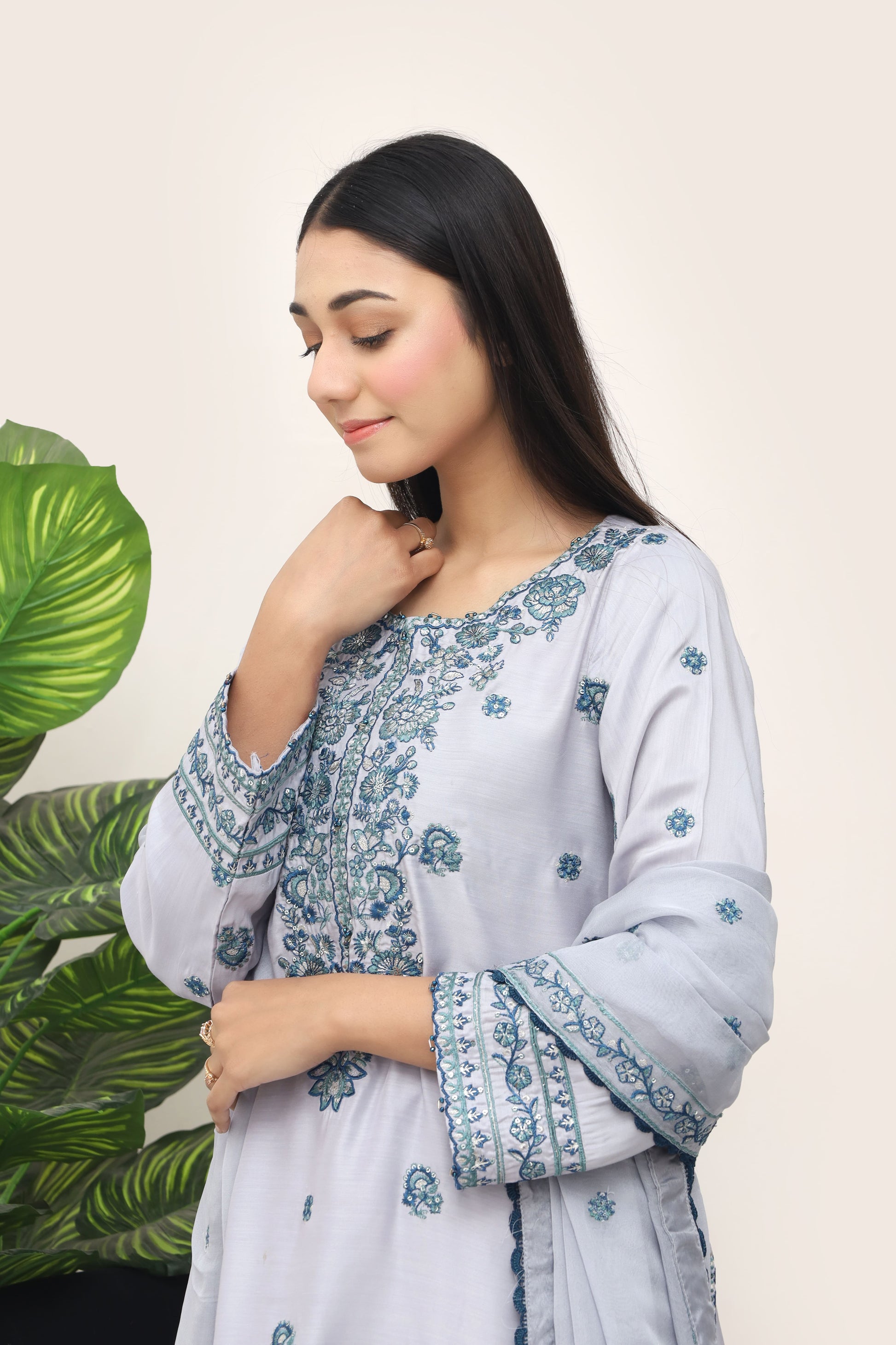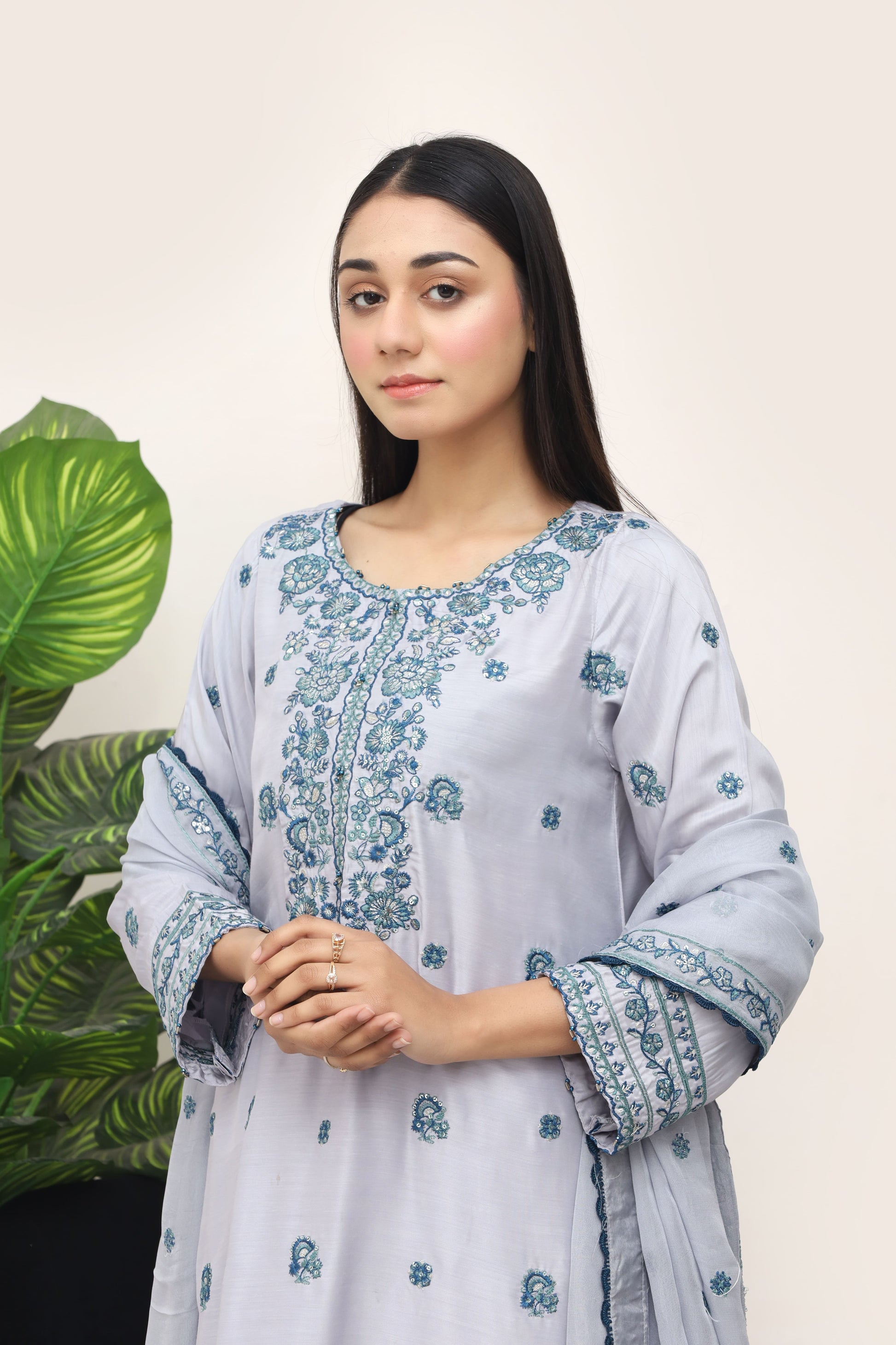 Description: Indulge in the richness of ethnic elegance with our Gray color article heavily embroidered with thread zari and sequins, The design is an ethnic masterpiece with gorgeous composition. It comes with straight trouser and an embroidered chiffon dupatta.